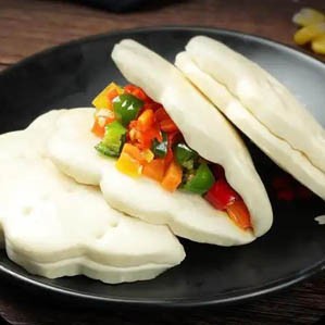 Gua bao is a popular street food in China. It consists of a fluffy, folded steamed bun (similar to a lotus leaf bun) filled with a generous amount of filling, including rich braised pork belly, tangy pickled mustard greens, cilantro, and crushed peanuts. The sweet, salty, and spicy flavors intertwine, creating a complex and delicious taste. Although commonly called "pork belly bun," modern gua bao often includes other fillings such as fried chicken or mushrooms.